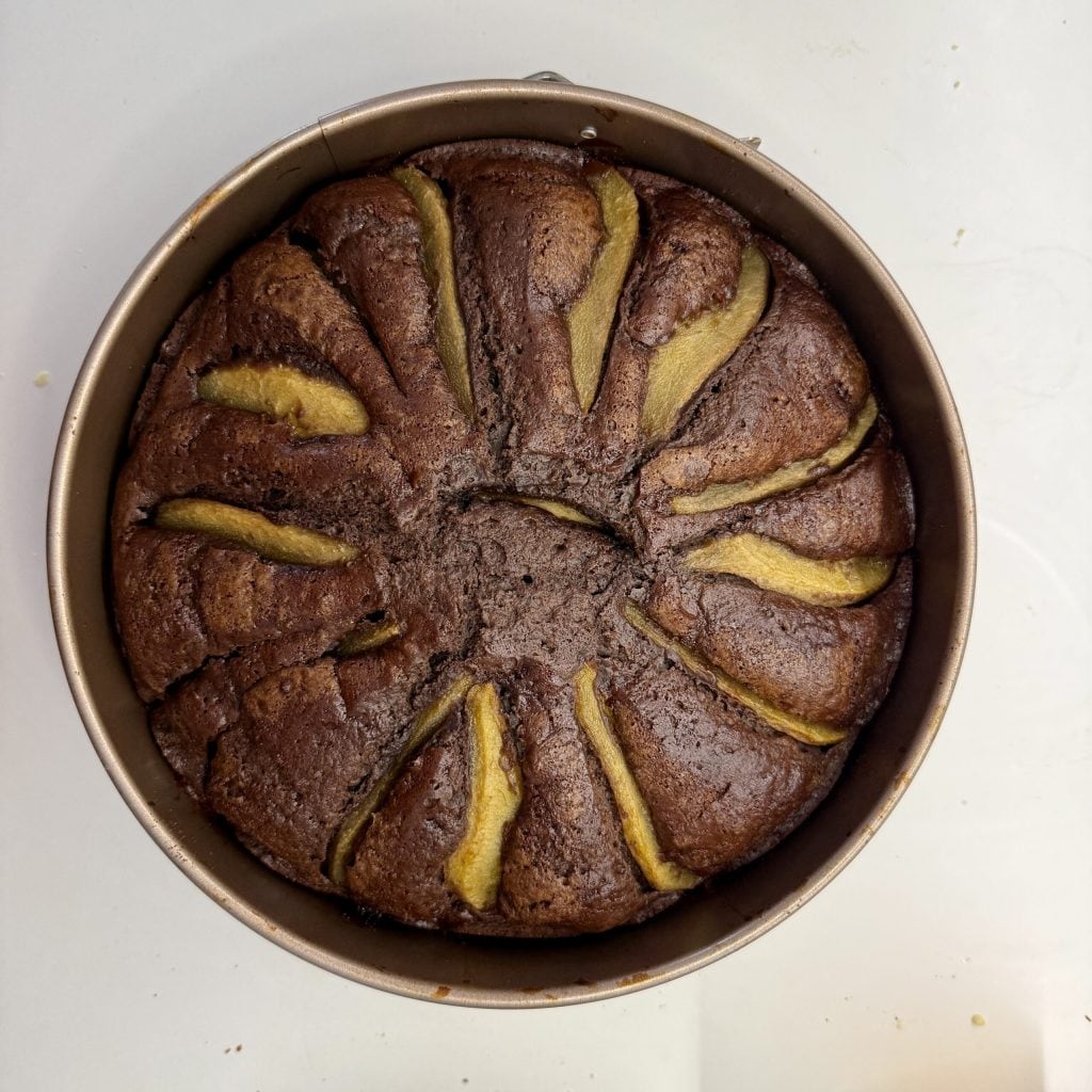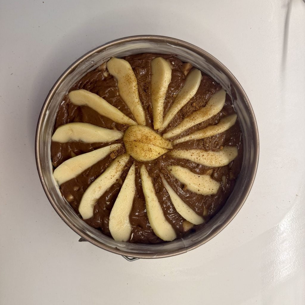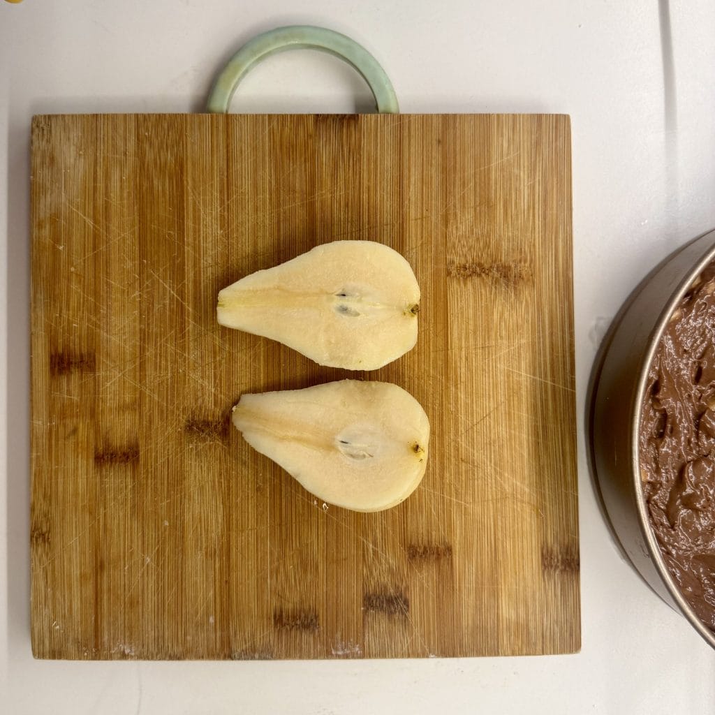 Peel a pear, cut it in half, remove the core and central filament, and cut it into slices. Arrange the slices in a radial pattern on the cake surface and sprinkle with brown sugar.