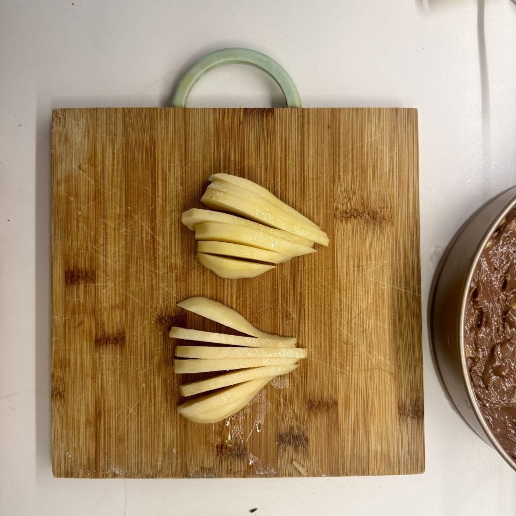 Arrange the slices in a radial pattern on the surface of the pear and chocolate cake.