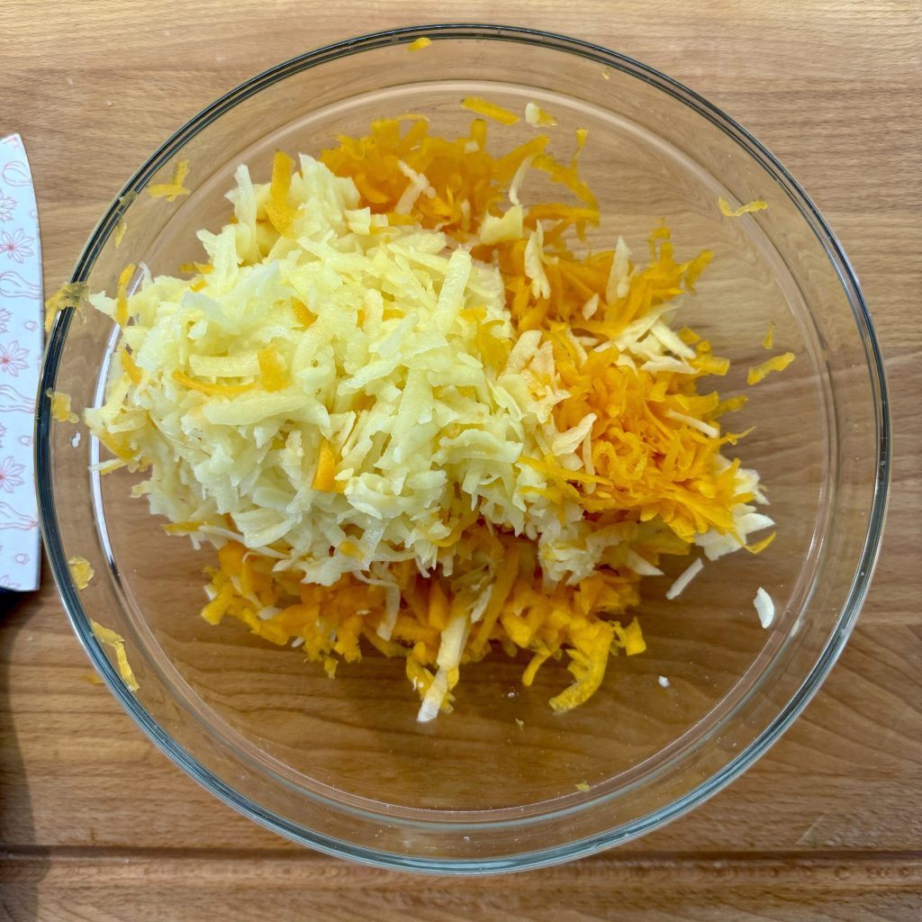 Take a bowl and grate the pumpkin and potatoes with a coarse grater.