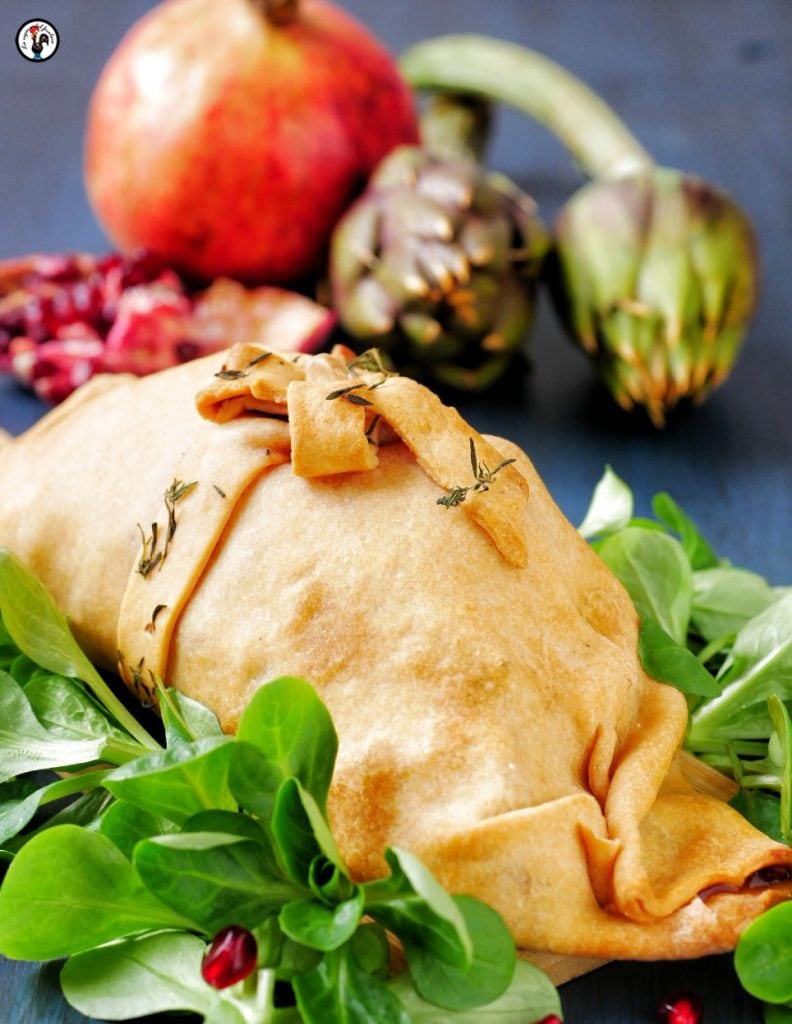 After freeing the now warm cotechino from the casing, place it on the bed of artichokes and pomegranate and close the dough like a package. Then (optional) cut two strips of leftover dough and enrich them with some fresh thyme leaves using the rolling pin; then form a dough bow that we will close with a piece of almond. The lentil-crusted cotechino cooks for 20 minutes at 375°F, but I recommend watching it.