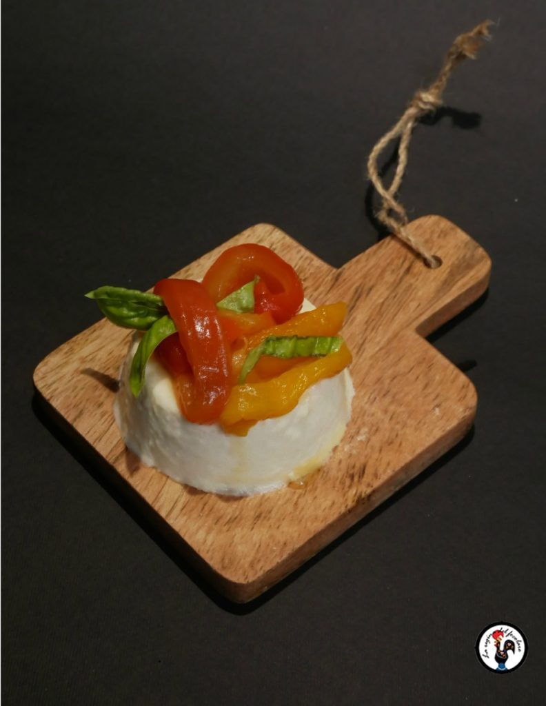 For the roasted pepper variation, place two small strips of already salted roasted pepper, one red and one yellow, on the panna cotta, and finish with very thinly sliced fresh basil.
