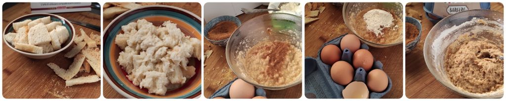 Let’s start by removing the crust from our roll: do not discard it; once dry, it will be perfect for making great breadcrumbs. Cut it into slices and put it in a fairly large bowl (in Genoa: the grilletto). Soak the bread with warm milk and let it soften well. Then, if necessary, squeeze it: I didn’t need to. Add sugar, cinnamon, orange zest, and mix carefully. Then combine the egg and the flour needed to obtain a homogeneous mixture from which we will make many small balls.