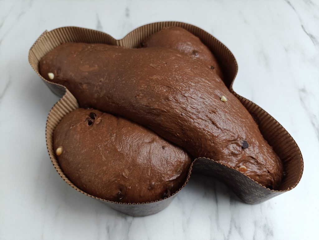 The chocolate colomba is a decadent variation of the classic Easter cake, featuring a soft dough enriched with chocolate chips and often covered with a dark glaze. Let’s prepare it together with this step-by-step photo recipe — it will be very easy. I used fresh brewer’s yeast since not everyone has access to sourdough starter.