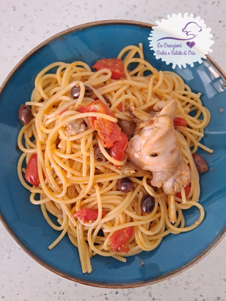 Our rabbit with cherry tomatoes and olives is ready to be enjoyed, if we want we can now proceed to cook the pasta, I recommend spaghetti cooked al dente and added, as I did, directly in the rabbit sauce. Enjoy your meal