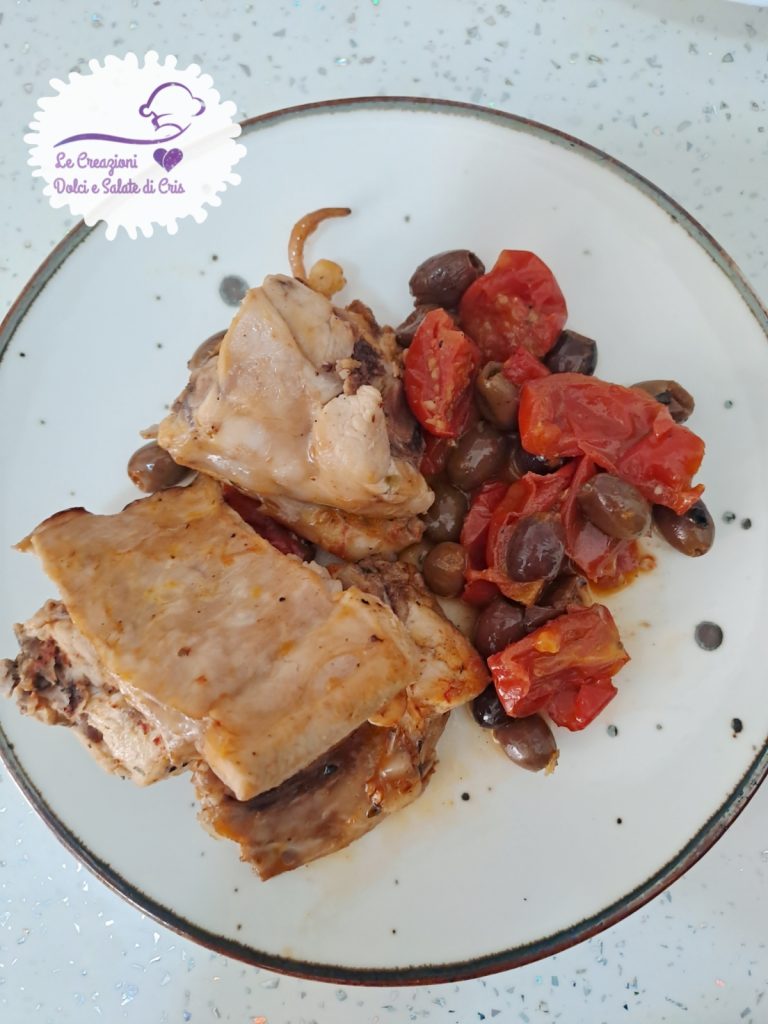Rabbit with cherry tomatoes and olives, or Mediterranean style, a delicious dish that I make too rarely. I really like white meats, especially for preparing such seasoned recipes, but not everyone in my family likes rabbit, so I don’t make it often. If you also don’t love rabbit, you can use this same recipe to prepare chicken.