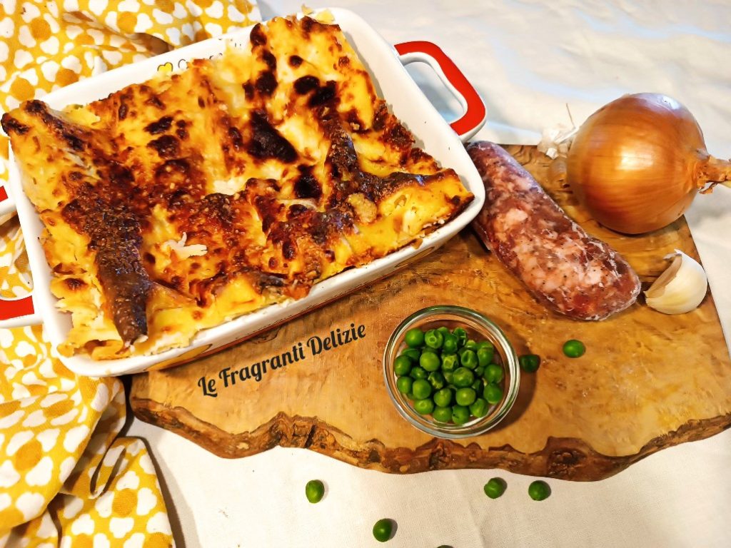 Lasagna with peas, mushrooms and sausage: an easy and tasty recipe, ideal to serve at Sunday lunch or during parties and special occasions. To prepare it you only need a few simple ingredients: mushrooms, sausage, peas, béchamel sauce and provola or mozzarella, cheese and of course lasagna sheets. A succulent first course that will win your guests over at the first bite.