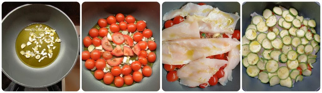 Take a large pan, add the extra virgin olive oil, and add the onion previously cleaned and sliced. Add the cherry tomatoes (making a layer), then the sea bream fillets, and finally cover everything with the zucchini slices. Dress with an additional drizzle of extra virgin olive oil, salt, and pepper (optional) to taste, and add the chili pepper if you want a spicy touch. Cook over moderate heat for about 15-20 minutes, stirring occasionally.