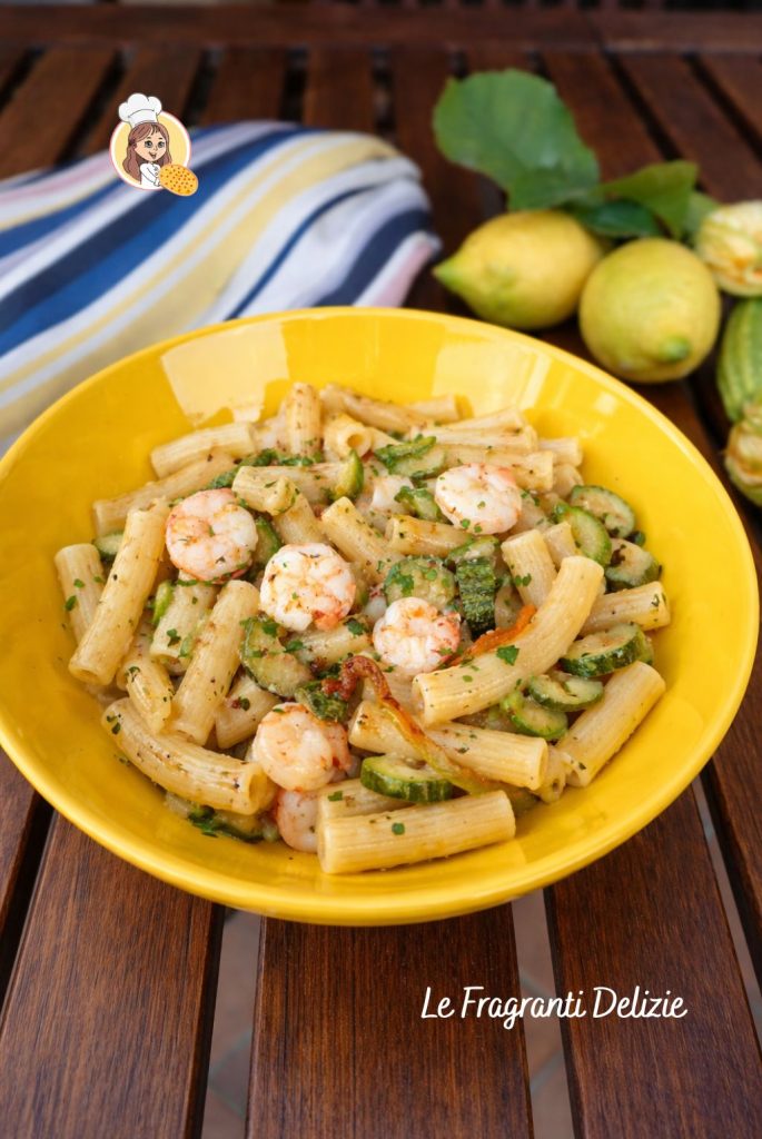 Pasta with first course, fragrant and light for summer, with the sweetness of fresh shrimp, the delicacy of zucchini flowers and a zesty lemon note that brings everything together.