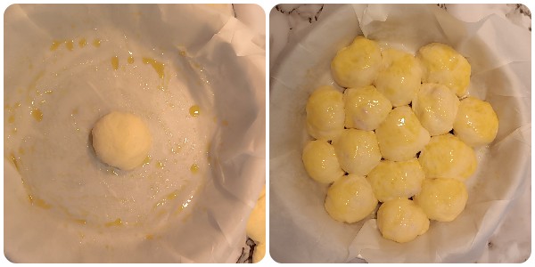 Then arrange the filled balls in a round baking pan about 10–11 inches (26–28 cm) in diameter, lined with baking paper lightly oiled, leaving some space between them. Cover the pan with a cloth and let rise again for about 1 hour, or until doubled.