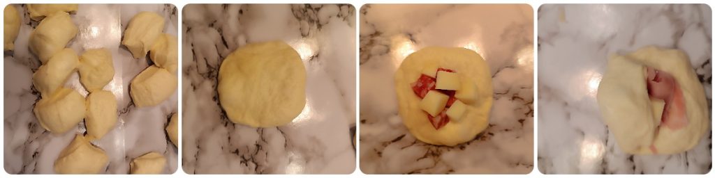 Once the dough has risen, deflate it and divide it into pieces of about 2 oz (50 g) each. Shape little balls and flatten them one at a time with your hands or with a small rolling pin; place a little provola and salami in the center. Close well forming smooth spheres and roll them on the work surface.