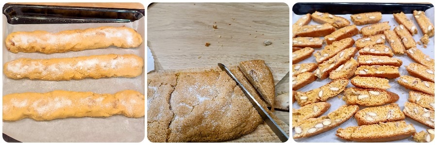 Once cooked, remove the cantucci from the oven and let them cool slightly. Cut them diagonally with a serrated knife, applying a firm but gentle pressure, at a distance of about 0.6 inches, giving them the characteristic shape. Place the cookies back on the baking sheet and bake again for another 10 minutes at a temperature of 320°F.