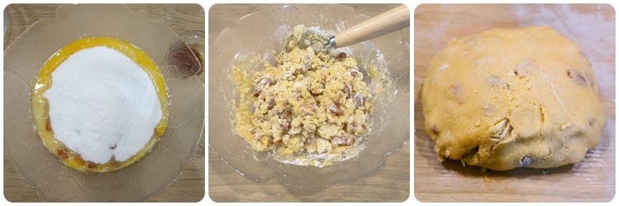 Start mixing with a whisk or spoon, when the dough has reached a certain consistency, transfer it to a work surface and continue to work the dough until it is compact.