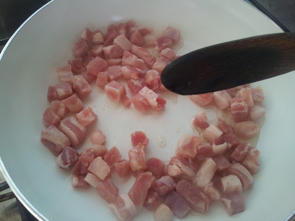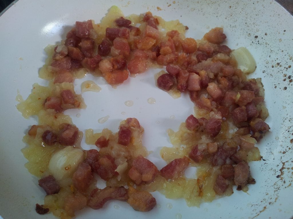 In a large pan, heat two tablespoons of oil and sauté the diced smoked bacon until crispy. Once ready, remove the bacon from the pan and set aside.