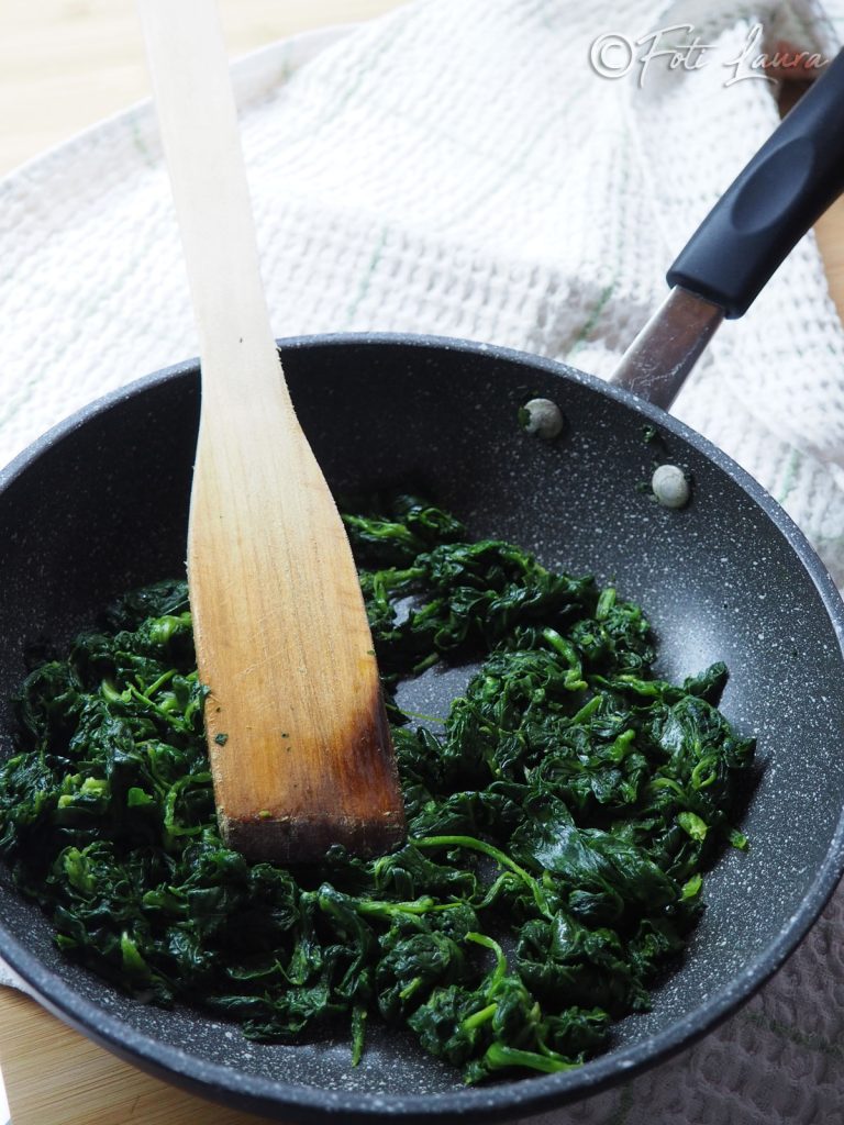 • If using fresh spinach, wash them thoroughly and remove the harder stems. If using frozen spinach, add them directly to the pan without thawing. In both cases, blanch the spinach in salted water for 5 minutes, then drain them well and squeeze to remove excess water. This step helps to keep the dish less watery.