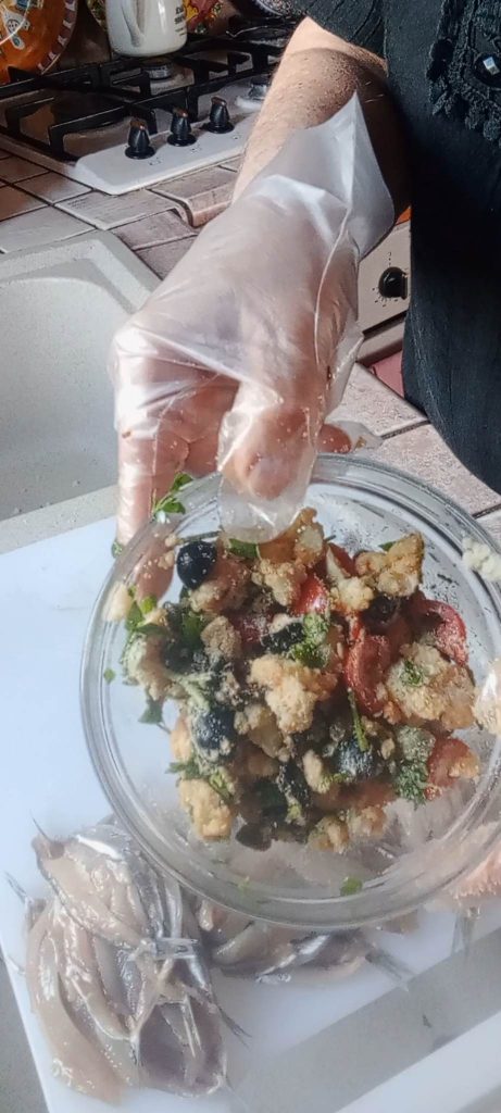 • Add the chopped tomatoes, minced parsley, capers, olives, cheese, chopped garlic if you like, salt and pepper, finally add a drizzle of oil and a little breadcrumbs. Mix everything well.