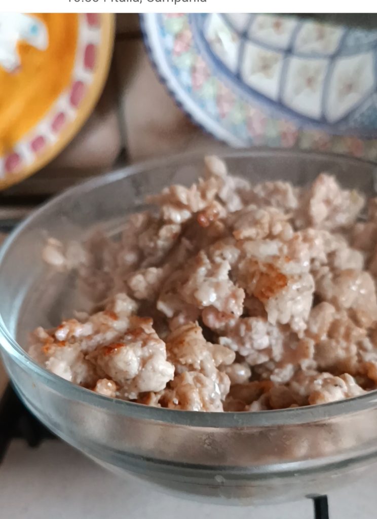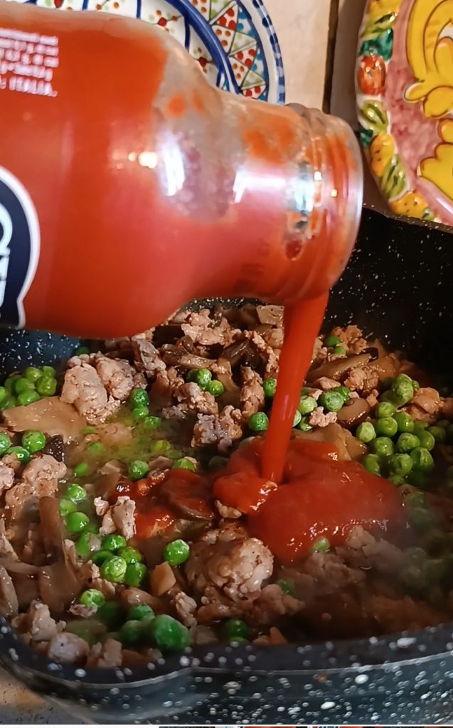 In the same pan, add EVO oil and sauté half an onion. Add the sausage, mushrooms, and peas with a little water. Let it simmer for a few minutes, then add the tomato puree, adjust the salt, add a few basil leaves, and if desired, add pepper or chili. Cook over low heat with a lid for about thirty minutes.