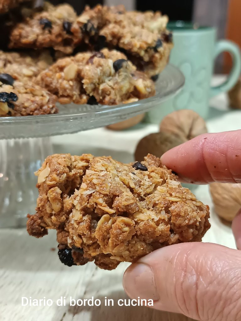Crunchy and delicious oatmeal cookies with dried fruit and chocolate chips, perfect for snacking at any time of the day. They are the ideal cookies for those who like to enjoy something tasty between meals, without feeling heavy or guilty. The presence of dried fruit and chocolate chips also makes these cookies energizing. The dried fruit can be replaced according to personal taste: walnuts, hazelnuts, dried figs, dried apricots, pine nuts, etc. Make them right away, but be careful, they are addictive.