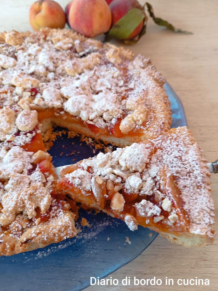 Peach tart with almond crumble is a delicious dessert to enjoy at any time of the day. For this dessert, you can use any type of peaches: yellow, white, flat. You can use your favorite shortcrust pastry recipe, or follow mine. The peaches are caramelized, and the addition of peach jam makes this dessert truly irresistible!