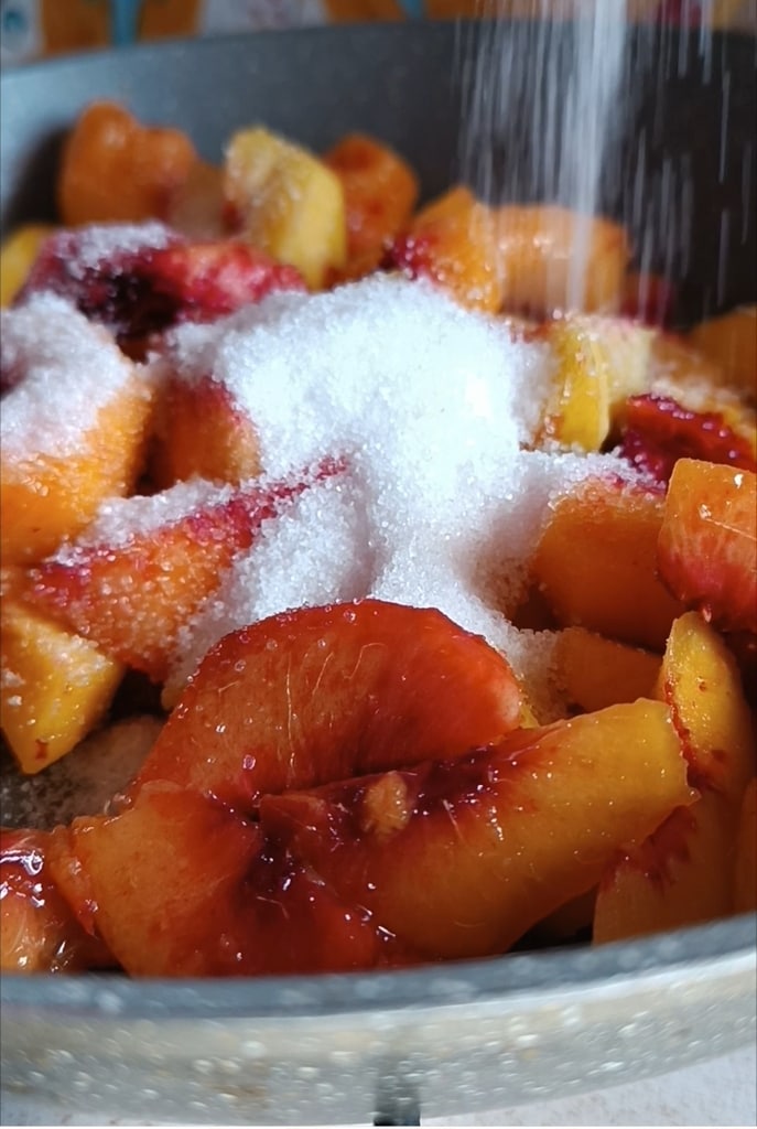 • Place the peaches, which have been previously peeled, sliced, and caramelized in a pan with sugar and a bit of cinnamon, on top.