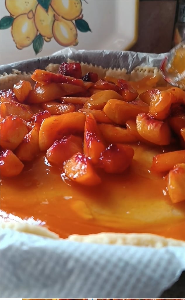 once the shortcrust pastry is rolled out in the 9-inch tart pan, spread the peach jam on top.