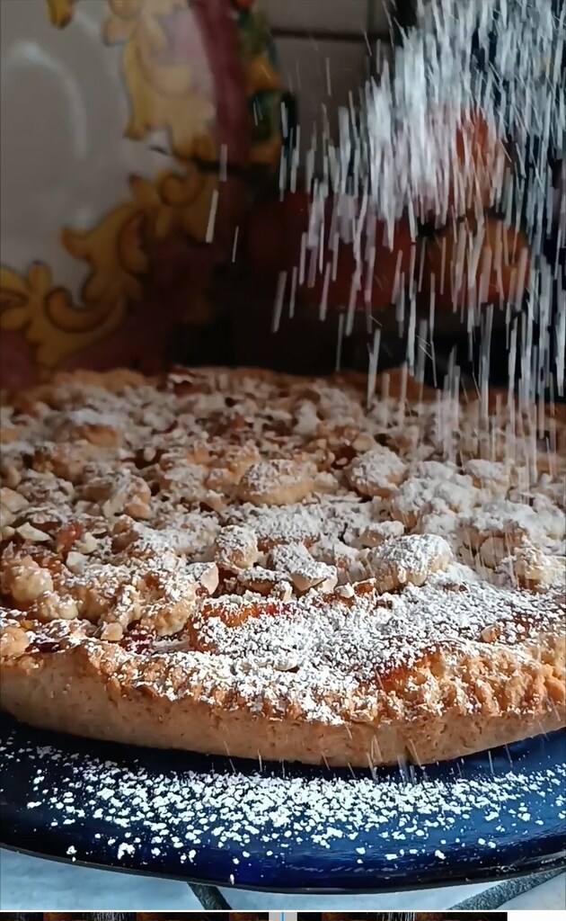 • Add the coarsely chopped almond granules on top and, if available, even the leftover shortcrust pastry in small crumbs.