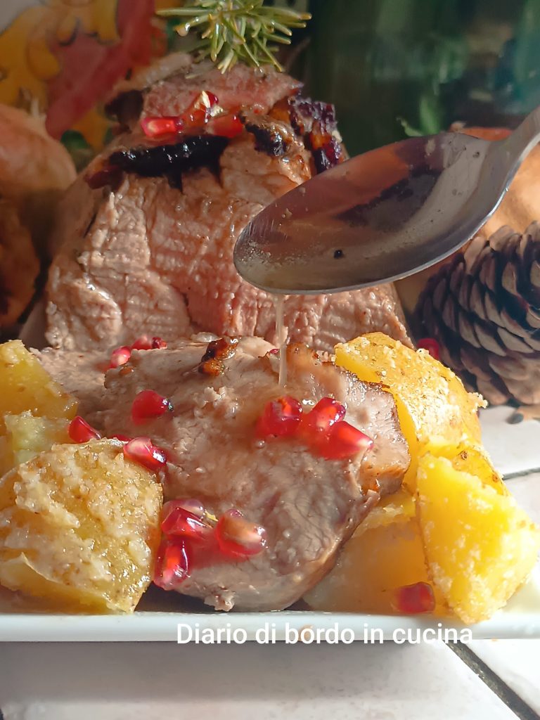 Pomegranate pork roast, a second course of meat, soft and juicy. It is the ideal main course for the Christmas holidays, as it is easy to prepare and the preparation can be anticipated. Moreover, it also presents well, the pomegranate seeds give this dish good fortune, making it suitable for the end-of-year table. To accompany this already rich dish, simply serve with baked potatoes.