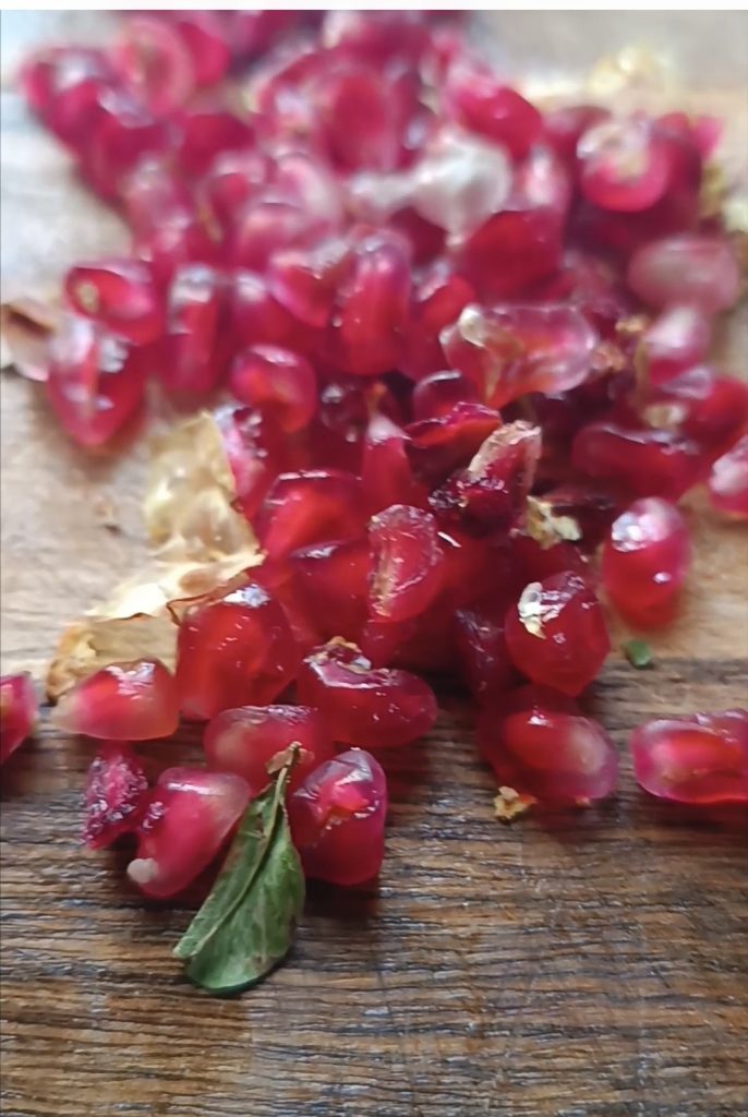 Seed a pomegranate, place the seeds in a potato masher (keep some seeds for garnish) and extract a small cup of juice.