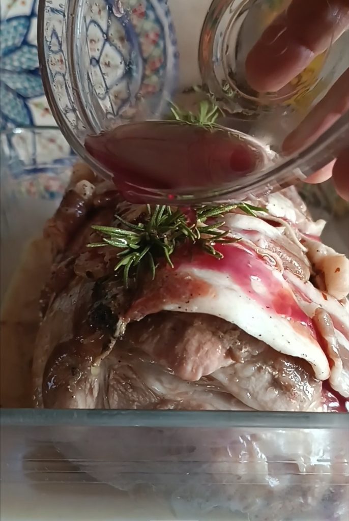 Deglaze with white wine, let the alcohol evaporate, turn off the stove, let the roast cool down.