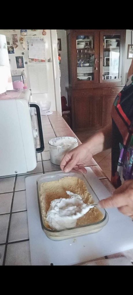 Blend the crackers until they are powdered. Melt the butter, add it to the crackers, and mix everything together. Transfer the mixture to a mold, level it well with a spoon, and keep it in the fridge while you prepare the cheese cream.