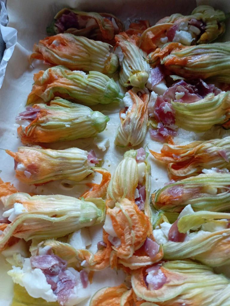 Place the pastry in a baking pan, and after pricking it, lay the stuffed zucchini flowers on top.