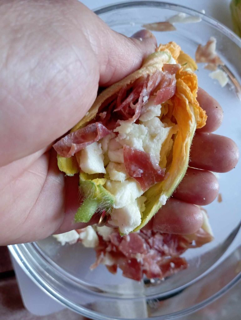 Wash and remove the pistil of the zucchini flowers. Cut the scamorza and salami into small pieces, mix everything, and fill the zucchini flowers with this filling.