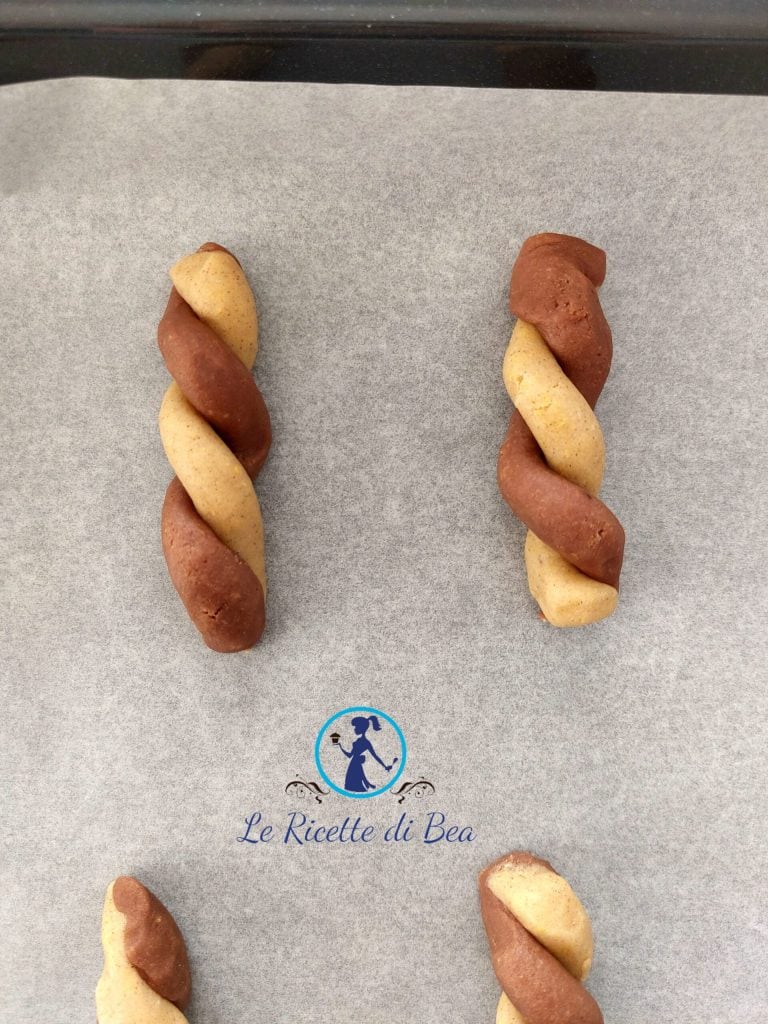 Take two strips of dough, one light and one dark, join only one of the two ends by applying light pressure. Then start braiding the doughs, as if making braids with only two strands; the more you manage to tighten them together, without breaking the dough, the more they will resemble mine and the famous cookies found in the supermarket snack aisle. Below, I’ll show you how they should be before placing them on the trays.