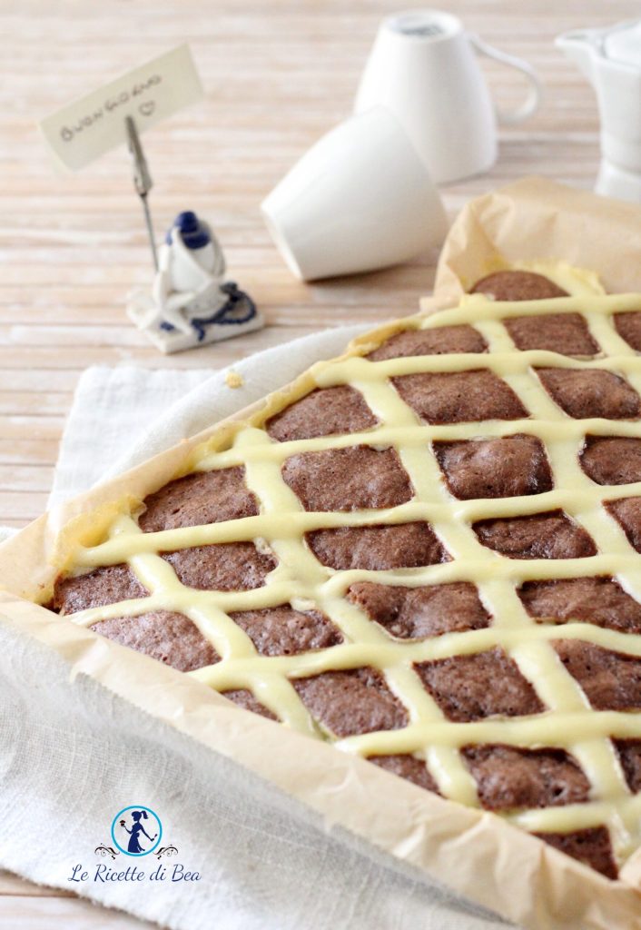 Then remove the cocoa cake and place it on the counter. Now, since it is still warm, retrieve the custard from the refrigerator and redraw any diagonals that sank too much during baking. The custard, meeting the still soft and warm cake, will be able to blend perfectly with the dessert, without dripping or sinking further.