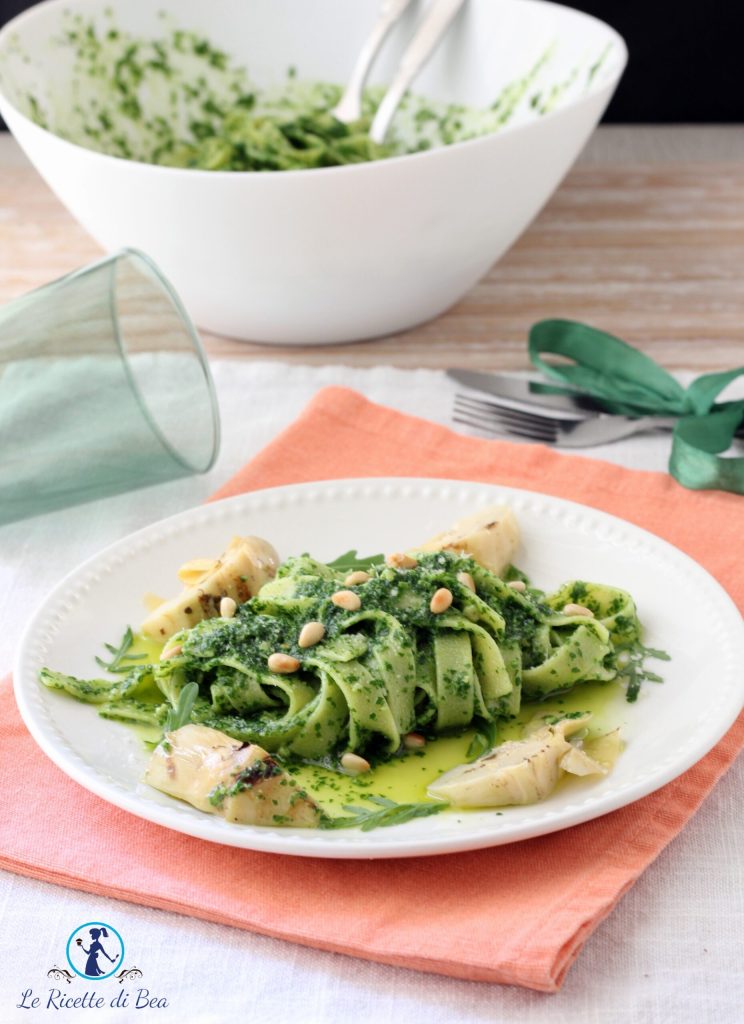 Recipe variations: as mentioned, you can reduce the oil by diluting with water. You can add a peeled garlic clove if you like. If you don’t have grilled artichokes, you can use marinated artichoke halves. If you want an arugula pesto that is not bitter, add ricotta or robiola while processing in the chopper. Finally, as you might guess, you can replace the fettuccine with any type of pasta you like, from long to short pasta.