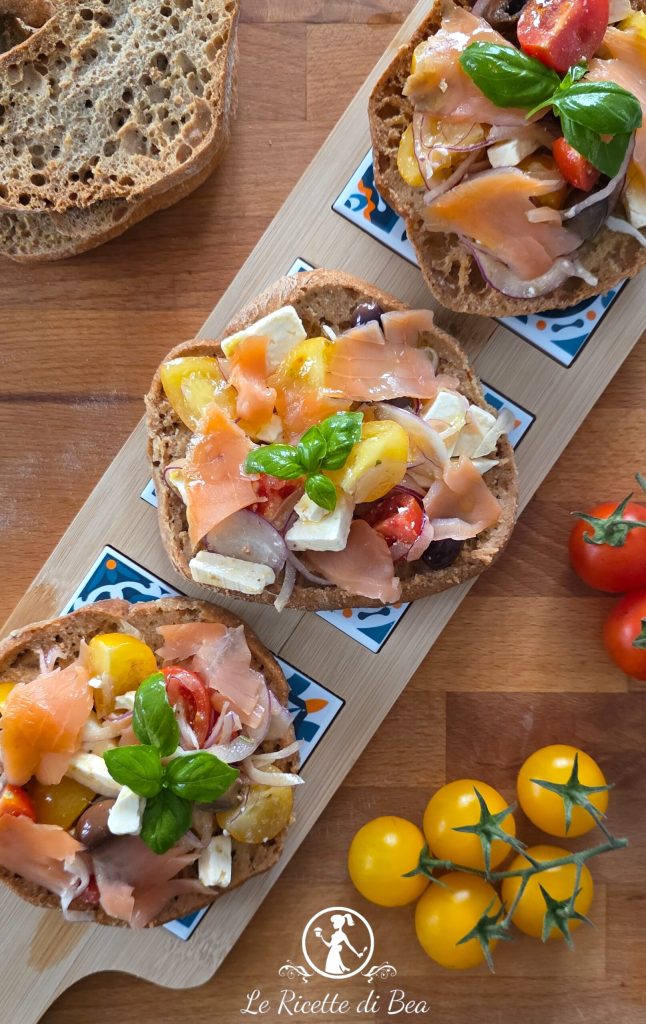 Ready for the warm season? Let’s start with friselle with smoked salmon, yellow and red cherry tomatoes, red onion, Taggiasca olives and Greek feta! An appetizer, an aperitif or a main to serve cold and without cooking, perfect for summer!