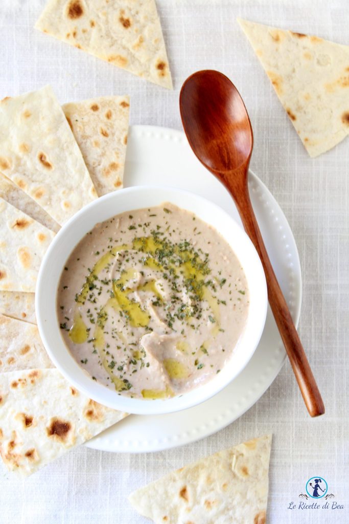 If you wondered: what to eat with bean hummus? Here are my answers. You can serve the borlotti hummus with a piadina well heated in a skillet, which becomes so crispy you can dip it into the bean cream. Then, of course, the classic pita bread or chapati. Don’t forget focaccia or toasted stale bread crostini baked with a pinch of salt and pepper. I think I answered your question: what to eat with hummus? I hope so! You can also use it for different appetizers than usual with chips and olives.
