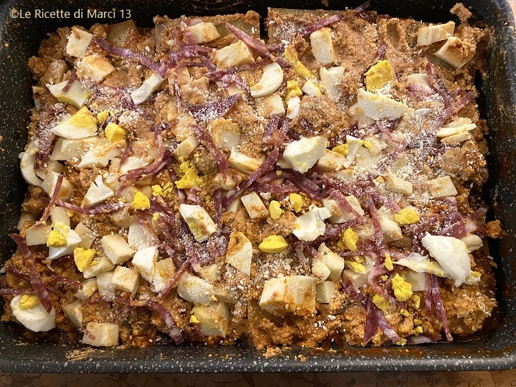 In truth, Jeanne Caròla Francesconi (the bible of Neapolitan cuisine) writes about Neapolitan lasagna, stating that the traditional version consists of: dark ragù, meatballs, ricotta, lasagna, sausage slices (browned separately with oil and lard, then added to the ragù with their juices), and fiordilatte (or mozzarella). She specifies that lasagna with salami (or dry sausages) instead of fresh sausage and hard-boiled eggs is a variant from Pozzuoli (a town a few kilometers from Naples), but I must say that over the years the Pozzuoli variant has surpassed the traditional one described by Francesconi (although personally, I prefer the latter).