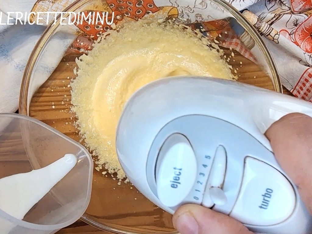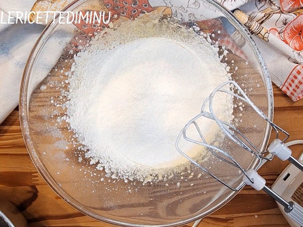 To the yolk and sugar mixture, add the oil, milk, and sifted flour while always working with the mixer.