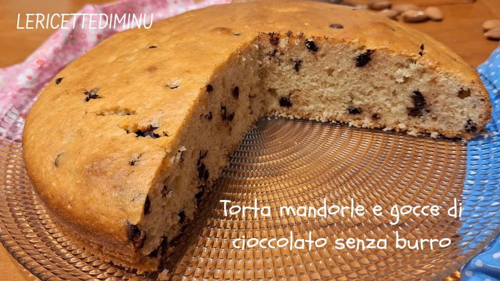 The almond and chocolate chip cake without butter is a delicate almond dessert with an extra indulgent touch given by the addition of dark chocolate chips, with a soft and moist texture just right, delicious both for breakfast and as a snack.