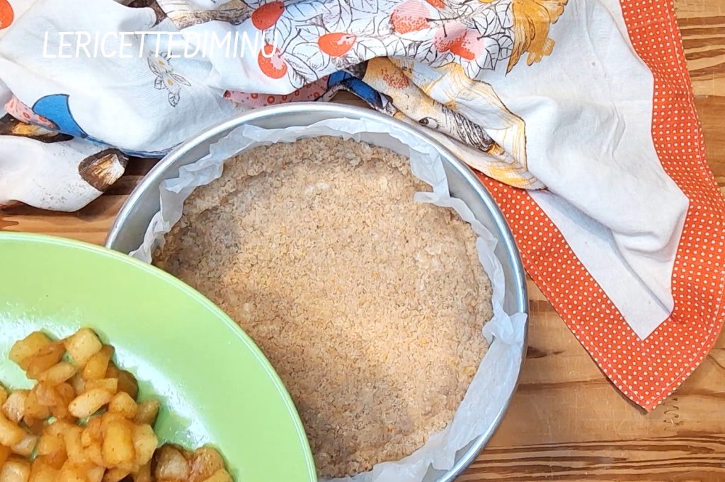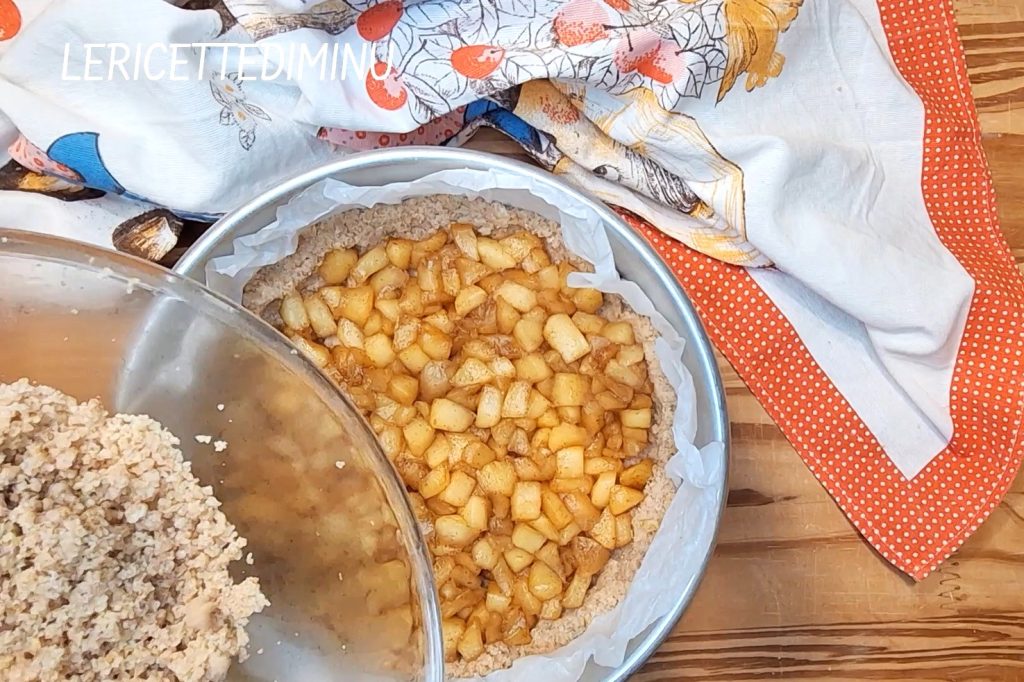 Pour the apple filling on the base and cover with the remaining dough, this time without pressing, but distributing it evenly over the apples.