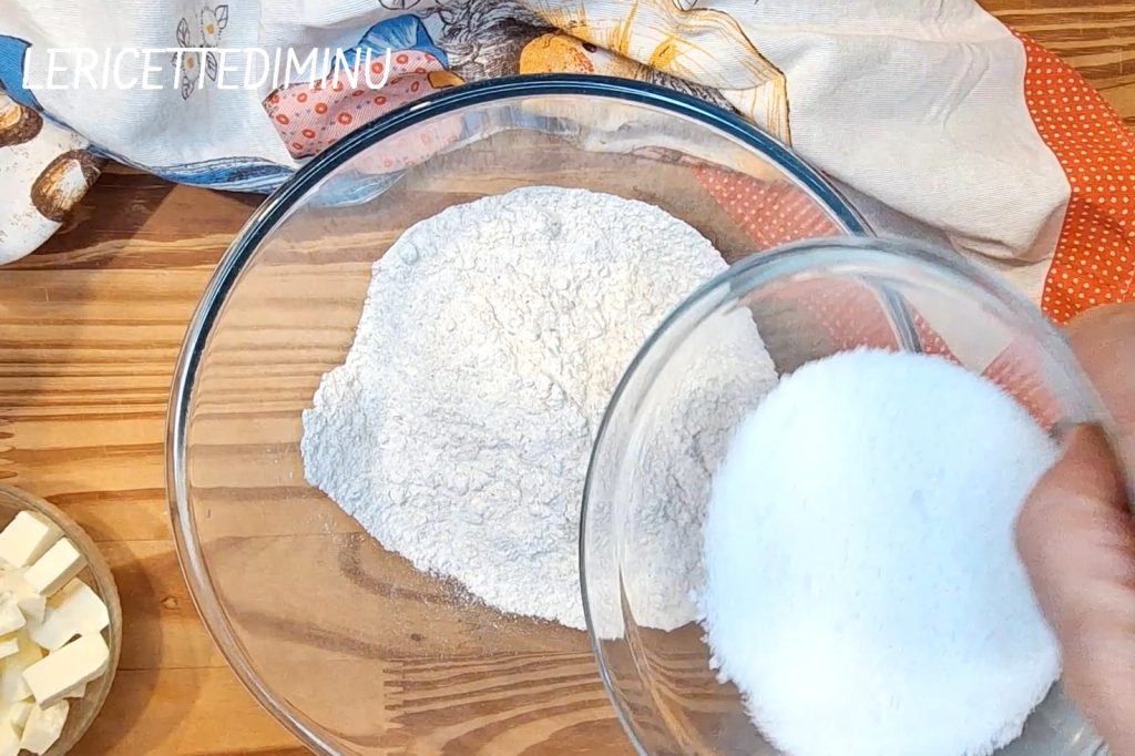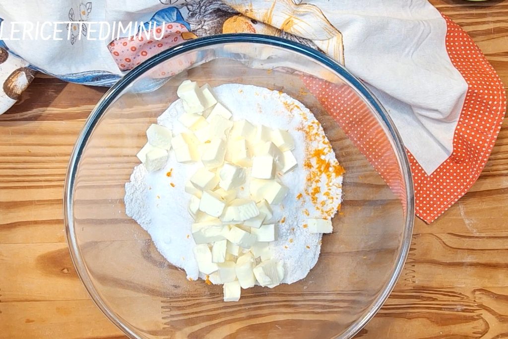 • In a large bowl, combine the flour, sugar, baking powder, a pinch of fine salt, grated organic orange peel, the egg, and cold butter cut into pieces.
