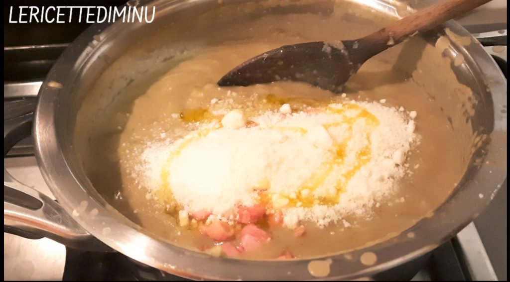 • Add half of the bacon, a tablespoon of oil, three tablespoons of grated Parmesan (or Grana) and mix well.