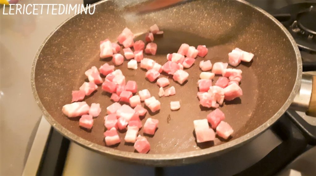 • In a non-stick pan, brown the smoked bacon until cooked without adding any other fats. It will take a few minutes.