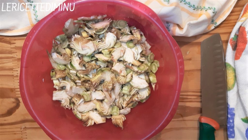 • Add the artichokes, which you will have sliced, and their stems cut into thin slices.