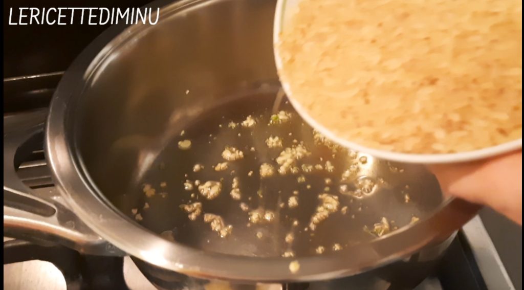 • Now focus on the rice by placing a few tablespoons of olive oil in a saucepan and 1 chopped (or crushed, if you want to remove it later) garlic clove.