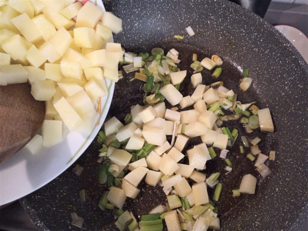 In another bowl filled with water only, drop the peeled and diced potatoes into not very large chunks.