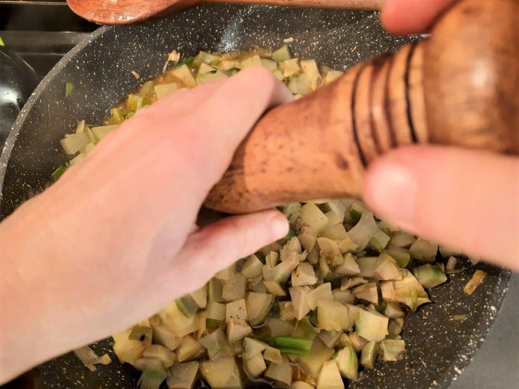After a few minutes, pour a glass of water into the pot, and when it starts boiling, add the peas.