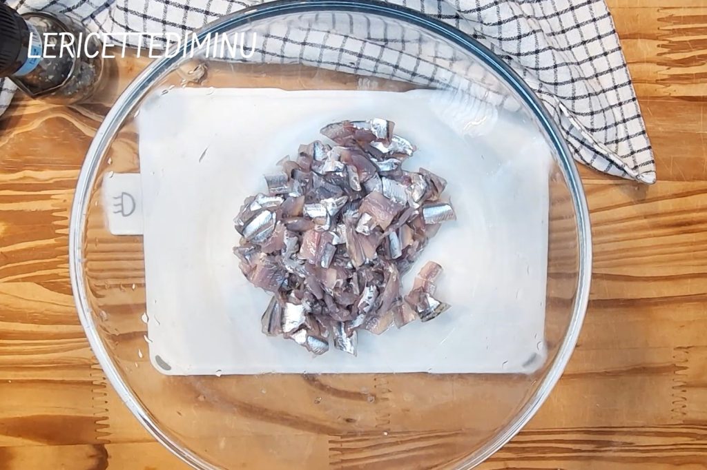 Let the anchovies drain in a colander, then place them a few at a time on a cutting board.After patting them dry with paper towels, cut them into pieces, removing the tails if still attached.