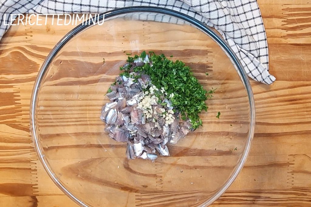 Transfer the anchovy pieces into a large bowl and add the finely chopped parsley and garlic.