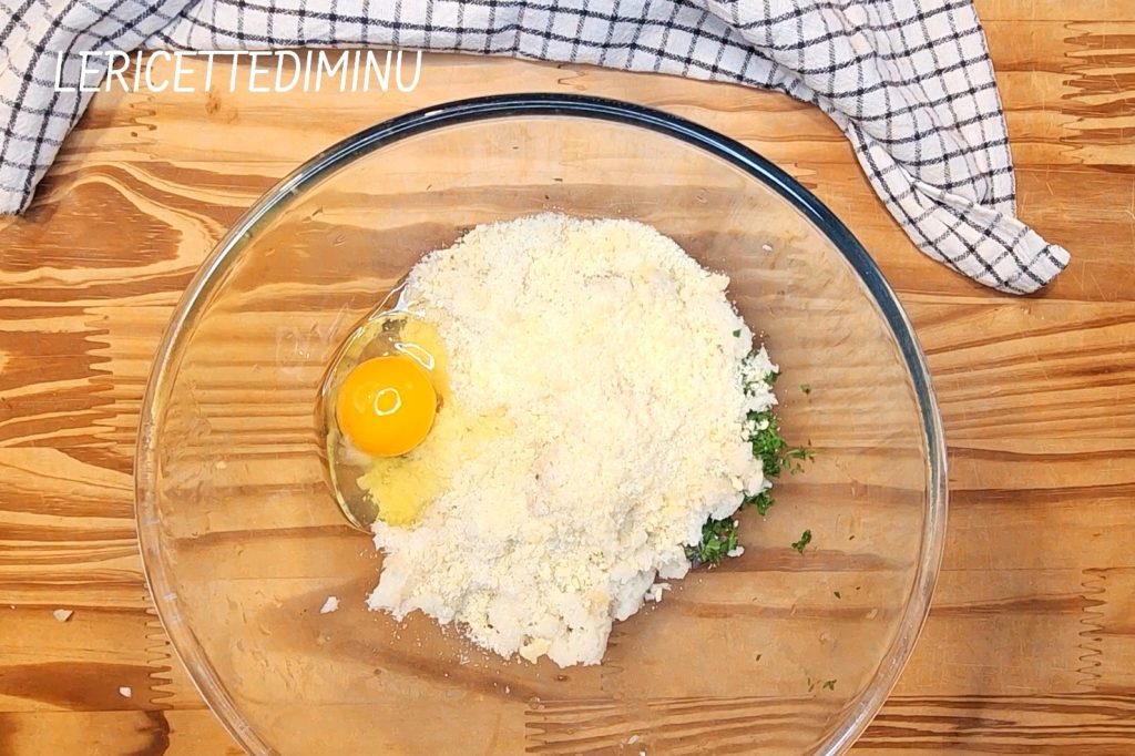 Add the well-squeezed and crumbled bread crumbs, freshly ground black pepper, grated Parmesan or Pecorino, and an egg, then mix.
